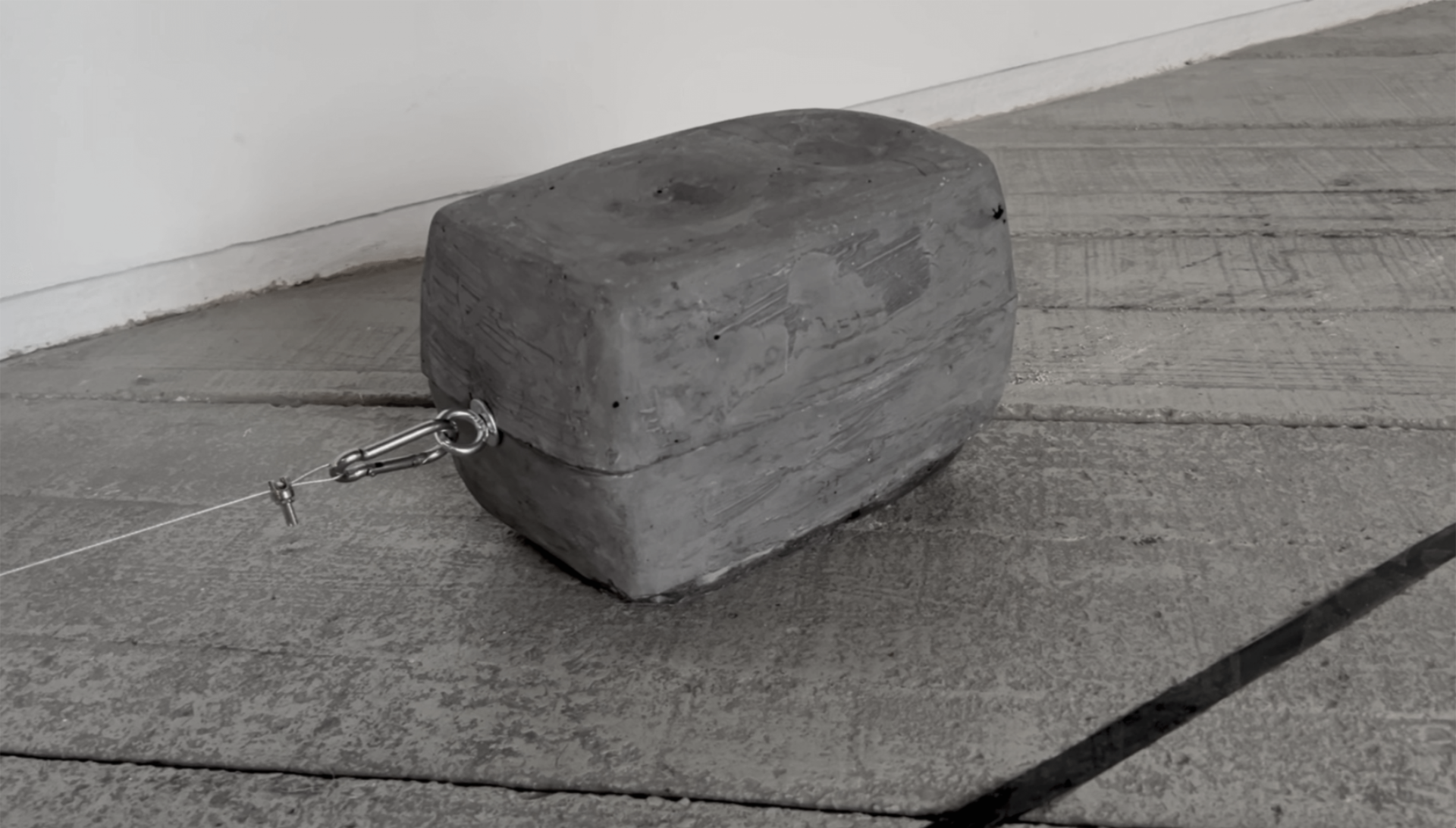 Um bloco de betão é lentamente arrastado pelo espaço da galeria, revelando de forma audível as texturas, imperfeições, densidades e microconfigurações do piso de betão. O som dessa fricção é amplificado, transformado e difundido por alto-falantes posicionados em diálogo com uma linha de força que estabelece uma relação específica com a sala. Na resistência oferecida pelo solo ao movimento do bloco, é a fricção que se torna audível. Mas o solo não é meramente um instrumento: a fricção é quase uma inscrição, quase uma gravação e, simultaneamente, uma (re)produção.